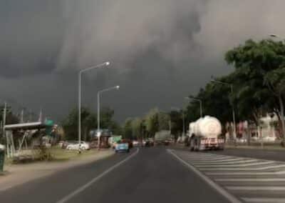 นครราชสีมา-ช่วงบ่ายจนถึงเย็นวันนี้ (4 เมษายน 2564) พายุฤดูร้อนได้เคลื่อนตัวเข้าสู่เขตอำเภอเมืองนครราชสีมา จังหวัดนครราชสีมา ทำให้ท้องฟ้ามืดครึ้มไปด้วยเมฆฝนทั่วบริเวณ ก่อนจะมีฝนเทกระหน่ำแบบไม่ลืมหูลืมตา ส่งผลทำให้ผู้ที่ขับขี่สัญจรบนถนนแทบจะมองไม่เห็นเส้นทาง ต้องชะลอความเร็วและเปิดไฟหน้ารถเป็นสัญญาณให้รถคันอื่นเพิ่มความระมัดระวังในการขับขี่มากขึ้น ขณะที่ประชาชนที่เพิ่งเลิกงานเตรียมจะกลับบ้าน ต้องหาที่หลบฝนไม่สามารถเดินทางฝ่าพายุกลับบ้านได้ เนื่องจากท้องฟ้าคะนอง มีฟ้าแลบ ฟ้าฝ่า และฝนตกหนัก