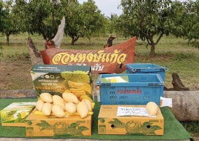ซึ่งคุณสมบัติของมะม่วงน้ำดอกไม้เพื่อการส่งออก คือ มีผิวนวล สีเหลืองอ่อน ไม่มีรอยแมลง รูปร่างไม่ผิดทรงมะม่วง น้ำหนักประมาณ 300-500 กรัมต่อลูก โดยปัจจุบัน มีการขายในระบบออนไลน์และส่งบรรจุกล่องขนาดเล็ก น้ำหนัก 5 กิโลกรัม ในราคา 250 บาท ส่วนกล่องขนาดใหญ่ น้ำหนัก 10 กิโลกรัม ราคา 450 บาท หรือถ้าหากต้องการเก็บผลผลิตชิมมะม่วงสดจากต้น ก็สามารถมาเก็บทานได้ในราคากิโลกรัมละ 25 บาท แต่อย่าลืมนำข้าวเหนียมมูลและน้ำกะทิติดไม้ติดมือไปด้วย จะได้รับประทานคู่กันในเมนูข้าวเหนียวมะม่วง ซึ่งท่านใดที่สนใจมะม่วงน้ำดอกไม้สีทองมาตรฐานส่งออก สามารถสั่งซื้อได้ที่สวนมะม่วงหงษ์แก้ว หมายเลขโทรศัพท์ 092-152-4899 ทางสวนจะบรรจุกล่องส่งตรงให้ถึงหน้าบ้าน
