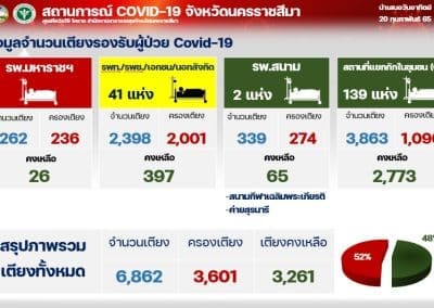 ซึ่งศูนย์โควิด 19 โคราช สำนักงานสาธารณสุขจังหวัดนครราชสีมา รายงานว่า จำนวนเตียงรองรับผู้ป่วยติดเชื้อโควิด 19 ในโรงพยาบาลทั้ง 32 อำเภอของจังหวัดนครราชสีมา ทั้ง โรงพยาบาลหลัก เช่น รพ.มหาราชฯ รพ.เทพรัตน์ รพ.มทส. รพ.ค่ายสุรนารี รพ.ท้องถิ่น รพ.ชุมชน และ รพ.เอกชน ตอนนี้จำนวนเตียงค่อนข้างตึงตัว หลายแห่งใกล้ล้น ต้องบริหารจัดการผู้ป่วยให้เหมาะสม โดยกระจายผู้ป่วยติดเชื้อที่อาการไม่หนัก ไปรักษาตัวที่ รพ.สนาม หรือหากอาการน้อย / ไม่แสดงอาการ ให้ไปรักษาตัวในสถานกักตัวชุมชน CI ให้มากขึ้น และหากผู้ป่วยเคสสีเขียวรายใด มีความพร้อมกักตัวที่บ้านได้ ก็ให้เข้าระบบ HI กักตัวที่บ้าน เพื่อสำรองเตียงไว้รองรับผู้ป่วยติดเชื้อที่อาการรุนแรงได้อย่างเพียงพอ