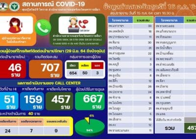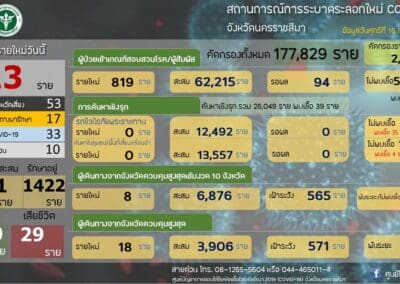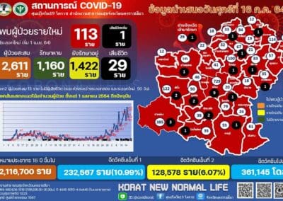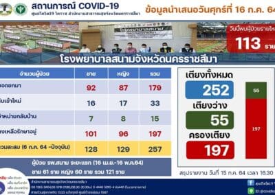นครราชสีมา – ผู้สื่อข่าวรายงานว่า สถานการณ์การระบาดของไวรัสโควิด-19 ในพื้นที่ จ.นครราชสีมา ยังคงเพิ่มขึ้นอย่างต่อเนื่อง โดยข้อมูลวันนี้ (16 กรกฎาคม 2564) พบผู้ป่วยรายใหม่เพิ่มขึ้นอีก 113 ราย โดยเดินทางมาจากพื้นที่เสี่ยง 53 ราย , เป็นการรับผู้ป่วยกลับมารักษาที่จังหวัดฯ 17 ราย ,จากการสัมผัสผู้ป่วยโควิด19 อีก 33 ราย และอยู่ระหว่างสอบสวนโรค 10 ราย รวมมีผู้ป่วยสะสมแล้ว 2,611 ราย ซึ่งรักษาหาย 1,160 ราย ยังรักษาอยู่ 1,422 ราย และเสียชีวิตเพิ่มอีก 1 ราย รวมเสียชีวิตสะสม 29 ราย ซึ่งนายแพทย์นรินทร์รัชต์ พิชญคามินทร์ นายแพทย์สาธารณสุขจังหวัดนครราชสีมา เปิดเผยว่า ขณะนี้โรงพยาบาลสนาม 2 แห่ง ในอาคารชาติชายฮอลล์ และอาคารลิปตพัลลภฮอลล์ ภายในสนามกีฬาเฉลิมพระเกียรติ 80 พรรษา อ.เมืองนครราชสีมา ที่รองรับผู้ป่วยได้ 252 เตียง ล่าสุด รับผู้ป่วยเข้ามารักษาใน รพ.สนามแล้ว จำนวน 197 เตียง ยังคงเหลือเตียงว่างอีก 55 เตียง ส่วนโรงพยาบาลในพื้นที่ จ.นครราชสีมา ซึ่งมีอยู่ทั้งหมด 37 แห่ง ขณะนี้รับผู้ป่วยมารักษาแล้ว จำนวน 1,226 เตียง ซึ่งมี รพ.จำนวน 11 แห่ง รับผู้ป่วยเต็มหมดแล้ว จึงส่งผู้ป่วยอาการเบามาที่ รพ.สนาม ถึงอย่างไรก็ตาม กรณีที่ช่วงนี้มีประชาชนจำนวนมาก ที่เดินทางมาจากจังหวัดพื้นที่เสี่ยง กรุงเทพมหานคร และภาคกลาง กลับภูมิลำเนา
