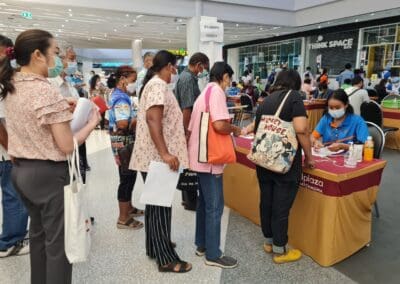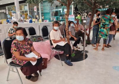 นครราชสีมา – เช้าวันนี้ (9 มิถุนายน 2564) ผู้สื่อข่าวรายงานบรรยากาศการฉีดวัคซีนต้านไวรัสโควิด- 19 ในพื้นที่จังหวัดนครราชสีมา โดยเฉพาะที่ห้องโคราช Hall ชั้น 4 ศูนย์การค้าเซ็นทรัลพลาซ่านครราชสีมา ซึ่งเป็นจุดฉีดวัคซีนในความรับผิดชอบของโรงพยาบาลมหาราชนครราชสีมา ได้มีประชาชนเดินทางมาต่อคิวเพื่อรับการฉีดวัคซีน ต้านไวรัสโควิด- 19 กันอย่างคึกคัก โดยเฉพาะประชาชนกลุ่มผู้มีอายุ 60 ปีขึ้นไป และประชาชน 7 กลุ่มโรคเรื้อรัง ที่ลงทะเบียนในระบบหมอพร้อมและ Call Center ซึ่งทางโรงพยาบาลมหาราชนครราชสีมา ได้นัดหมายให้มาฉีดวัคซีน astrazeneca ในวันนี้เป็นวันสุดท้ายล็อตแรก ของเดือนมิถุนายน โดยจะเริ่มฉีด ตั้งแต่เวลา 10:00 – 18:00 น. ทำให้ประชาชนรีบมาต่อคิวเพื่อทำการวัดความดัน สอบประวัติ ตรวจสอบรายชื่อ และรอคิวเข้าฉีดวัคซีน ตามเวลาที่กำหนดกันอย่างคึกคัก
