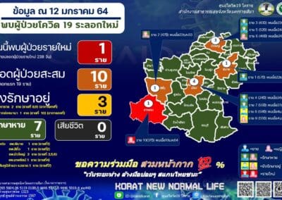 นครราชสีมา –วันนี้ (12 มกราคม 2564) นายแพทย์นรินทร์รัชต์ พิชญคามินทร์ นายแพทย์สาธารณสุขจังหวัดนครราชสีมา เปิดเผยว่า สถานการณ์การแพร่ระบาดของไวรัสโควิด19ระลอกใหม่ในพื้นที่จังหวัดนครราชสีมา หลังจากไม่พบผู้ติดเชื้อมาตั้งแต่วันที่ 1 มกราคม 2564 ล่าสุด วันนี้ (12 มกราคม 2564) พบผู้ป่วยรายใหม่ เป็นรายที่ 10 เป็นหญิง อายุ 37 ปี อาชีพแม่บ้าน มีประวัติเดินทางมาจากจังหวัดระยอง โดยไทม์ไลน์ ระบุว่า