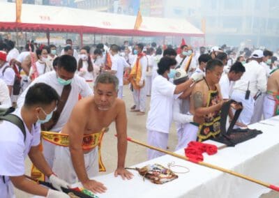 โดยนายภิญโญ วัจนศิริเสถียร ประธานชมรมไทย-จีนถือศีลกินเจโคราชในฐานะประธานจัดงาน ฯ ร่วมกับศาลเจ้า 26 ตำหนัก นำขบวนม้าทรงแสดงอภินิหารใช้เหล็กแหลมและของมีคมแทงทิ่มตามร่างกายอย่างน่าหวาดเสียว เพื่อทรมานและรับเคราะห์แทนผู้ร่วมประเพณีถือศีลกินผักเดินแห่ไปตามเส้นทางในเขต ทน.นครราชสีมา เป็นระยะทางประมาณ 8 กิโลเมตร เพื่อให้คนไทยเชื้อสายจีนและประชาชนที่ศรัทธาในองค์เทพเจ้าตั้งโต๊ะผลไม้ น้ำชา และจุดประทัดรับพระ เพื่อขอพรเสริมสิริมงคลให้กับตัวเองและครอบครัวมีความสุข ความเจริญในอาชีพการงาน ท่ามกลางนักท่องเที่ยวได้ถ่ายรูปเก็บไว้เป็นที่ระลึก