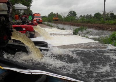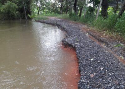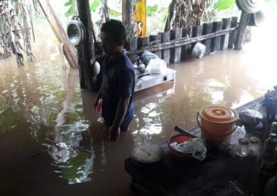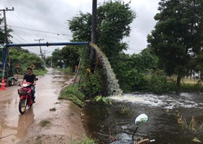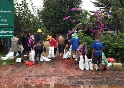 นายอรุณ ขันโคกสูง ผู้ใหญ่บ้านโพนสูง หมู่ที่ 4 ต.หมื่นไวย กล่าวว่า วันนี้น้ำในลำบริบูรณ์ได้เพิ่มสูงขึ้นติดต่อกันหลายวัน จนเกิดการล้นตลิ่งไหลเข้าท่วมบ้านเรือนประชาชนในหมู่บ้านโพนสูง ได้รับความเดือดร้อนไปแล้ว กว่า 20 หลังคาเรือน ซึ่งกระสอบทรายที่ทำเป็นคันกั้นน้ำเมื่อช่วงสัปดาห์ที่แล้วเริ่มจะเอาไม่อยู่แล้ว จึงได้สั่งทรายมากรอกลงในกระสอบอีกจำนวนมาก เพื่อนำไปเสริมเป็นคันกั้นน้ำริมตลิ่งลำบริบูรณ์ ระยะทางยาวกว่า 200 เมตร เพราะหากไม่กั้นไว้น้ำที่ล้นตลิ่งจะไหลเข้าท่วมบ้านเรือนประชาชนในหมู่บ้านโพนสูงกว่า 160 หลังคาเรือนแน่นอน และตอนนี้ก็ได้จัดชาวบ้านเป็นเวรยามเฝ้าระวังริมตลิ่งตลอด 24 ชั่วโมง เนื่องจากยังคงมีฝนตกลงมาในพื้นที่อย่างต่อเนื่อง ซึ่งชาวบ้านกลัวว่าหากมีพายุฝนลงมาอีกระลอกใหญ่ กระสอบทรายคันกั้นน้ำคงเอาไม่อยู่แน่