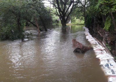นครราชสีมา – วันนี้ (8 ตุลาคม 2563) ผู้สื่อข่าวรายงานว่า สถานการณ์น้ำท่วมในพื้นที่ ต.หมื่นไวย อ.เมือง จ.นครราชสีมา ยังคงมีปริมาณน้ำไหลเข้าท่วมบ้านเรือนประชาชนเพิ่มขึ้นอย่างต่อเนื่อง โดยเฉพาะที่บ้านโพนสูง หมู่ที่ 4 ต.หมื่นไวย ซึ่งมวลน้ำจำนวนมากได้เริ่มเอ่อล้นตลิ่งลำบริบูรณ์ ที่เป็นลำน้ำสาขาของลำตะคอง ไหลเข้าท่วมบ้านเรือนประชาชนกว่า 20 หลังคาเรือน ชาวบ้านต้องเร่งนำทรายมากรอกในกระสอบ เพื่อนำไปทำเป็นคันกั้นน้ำไม่ให้ไหลเข้าท่วมชุมชนที่อาศัยอยู่ใกล้ลำบริบูรณ์ หลังจากพบว่าระดับน้ำในลำบริบูรณ์เพิ่มสูงขึ้นจนล้นตลิ่งไปแล้วหลายจุด