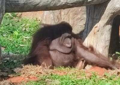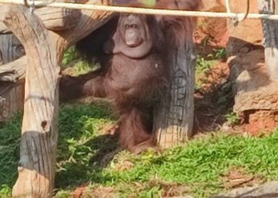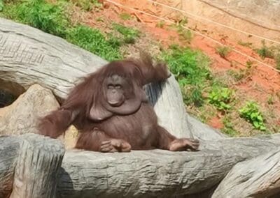 ลิงอุรังอุตัง เป็นลิงที่มีรูปร่างคล้ายคน ไม่มีหาง แขนยาวแต่ขาสั้นและค่อนข้างเล็ก มีขนยาวหยาบรุงรังสีน้ำตาลแดง หูเล็กมากเมื่อเทียบกับของชิมแปนซีและกอริลล่า สามารถพบได้ตามป่าร้อนชื้นของเกาะบอร์เนียว และเกาะสุมาตรา ประเทศอินโดนีเชีย อาหารหลัก ได้แก่ผลไม้ป่าชนิดต่าง ๆ ใบไม้กิ่งไม้สดๆ และยังกินพวกแมลง ไข่นก สัตว์เล็กอื่นๆ