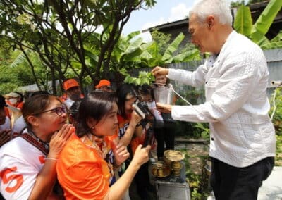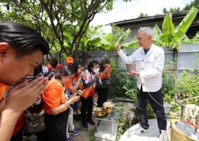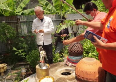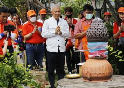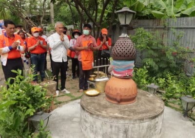 คุณนก บอกว่าวันนี้ดีใจและถือเป็นเกียรติที่บ้านคุณย่าโม ได้ต้อนรับท่านเพราะโดยส่วนตัวเคารพรักท่านมานานแล้วจึงได้เตรียมดอกมะลิ น้ำอบไทยไว้ให้ท่านพร้อมคณะได้กราบขอพรคุณย่าโม ที่บ่อน้ำศักดิ์สิทธิ์ และตักน้ำจากบ่อน้ำศักดิ์สิทธิ์ให้ท่านดื่มและล้างหน้า เพื่อความเป็นสิริมงคล มีชัยชนะ ศัตรูแพ้พ่าย