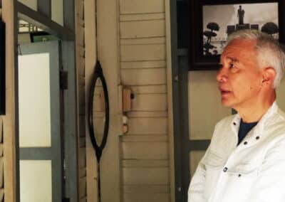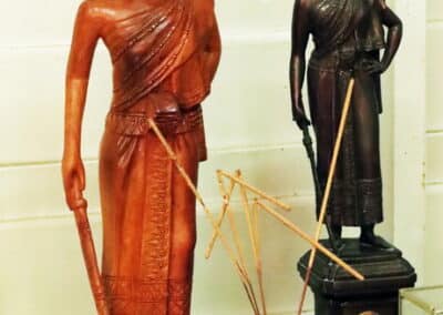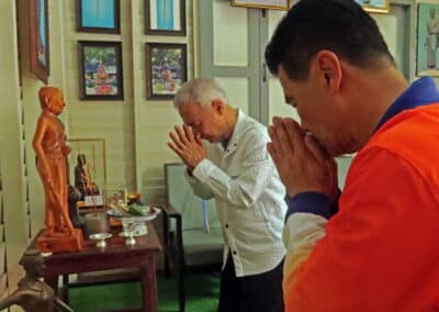 จากนั้น คุณสุวัจน์ พร้อมคณะเข้าเยี่ยมชมเรือนไทยโบราณสองชั้น (สร้างบนที่ดินคุณย่าโม) และกราบขอพรจากรูปหล่อคุณย่าโมที่ตั้งประดิษฐ์อยู่สององค์ อายุกว่า 90 ปี องค์แรกเป็นรูปหล่อสัมฤทธิ์ องค์ที่สองแกะสลักจากไม้ขนุน โดยภายในห้องรับแขกถูกออกแบบเป็นนิทรรศการภาพถ่ายคุณย่าโม ภาพสาแหรกต้นตระกูล ภาพเมืองโคราชในอดีต