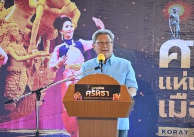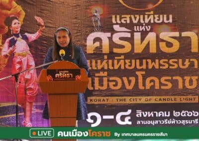 วันที่ 21 กรกฎาคม 2566 เวลา 18.00 น. ที่ศาลาไทยลานอนุสาวรีย์ท้าวสุรนารี ถ.ราชดำเนิน อ.เมือง จ.นครราชสีมา นายภูมิสิทธิ์ วังคีรี รอง ผวจ.นครราชสีมา พร้อมด้วยนายประเสริฐ บุญชัยสุข นายกเทศมนตรีนครนครราชสีมา , พ.ต.อ.ประสิทธิ์ เปรมกมล ผกก.สภ.มืองนครราชสีมา , น.ส.กรรณิการ์ พัฒนพีระเดช นายกเทศมนตรีตำบลพิมาย , นางสุทิน ชาติพุดซา นายกเทศมนตรีตำบลหนองกระทุ่ม , น.ส.เกตน์สิรี สมบูรณ์ศิลป์ , รอง ผอ.ททท. สำนักงานนครราชสีมา และ ผู้ช่วยศาสตราจารย์ ดร.ณัฏฐินี ทองดี ผอ.สถาบันไม้กลายเป็นหินฯ ร่วมกันแถลงข่าวความพร้อมการจัดงานประเพณีแห่เทียนพรรษา ประจำปี 2566 ภายใต้ ชื่องาน “แสงเทียนแห่งศรัทธา แห่เทียนพรรษาเมืองโคราช” Korat : The City of Candle Light ระหว่างวันที่ 1-4 สิงหาคม 2560 ณ บริเวณลานอนุสาวรีย์ท้าวสุนารี สวนสุรนารี และสวนเมืองทอง โดยมีส่วนราชการ ภาครัฐ ภาคเอกชน ภาคเศรษฐกิจ และภาคการท่องเที่ยว สถาบันการศึกษา ประชาชนทั่วไปพร้อมใจสวมใส่เสื้อผ้าชุดผ้าไหมไทย นุ่งผ้าไทย ใส่ผ้าซิ่น