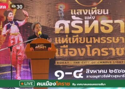 แห่เทียนพรรษาโคราช “แสงเทียนแห่งศรัทธา แห่เทียนพรรษาเมืองโคราช” Korat : The City of Candle Light ประกวดต้นเทียนพรรษา ชิงถ้วยพระราชทานสมเด็จพระเทพฯ ประกวดขบวนแห่ต้นเทียนที่วิจิตรตระการตาแสดงความเป็นอัตลักษณ์ รวมถึงสีสันขบวนแห่ที่หลากหลาย