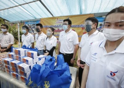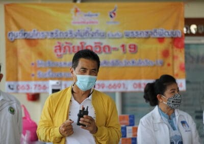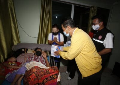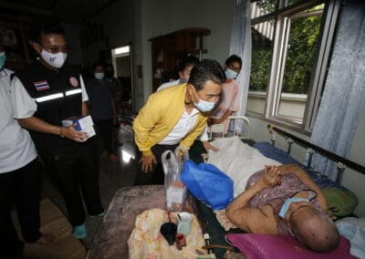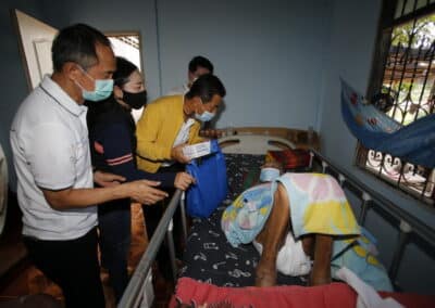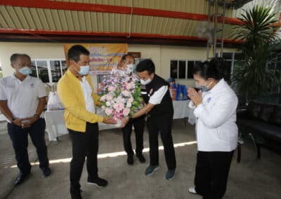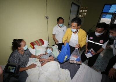 จากนั้นเดินทางไปมอบอุปกรณ์ทางการแพทย์ ที่รพ.สต.ศรีษะละเลิง ต.บ้านใหม่ อ.เมือง จ.นครราชสีมา พร้อมมอบถุงน้ำใจให้แก่ผู้ป่วยติดเตียง จำนวน 8 ถุง หน้ากาก 8 กล่อง ไข่ 8 แผง โดยมีนายธีรวีร์ มิตรสูงเนิน สจ.เขต 6 อ.เมือง จ.นคราชสีมา และนางมะลิวัลย์ บางนิ่มน้อย (หมออ้วน) นายกเทศมนตรีตำบลบ้านใหม่ ร่วมลงพื้นที่เยี่ยมผู้ป่วยติดเตียง ผู้พิการ เพื่อเป็นกำลังใจในการสู้โควิด-19