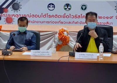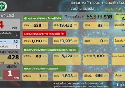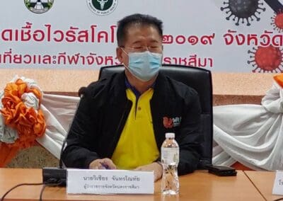 นครราชสีมา – วันนี้ (2 พฤษภาคม 2564) นครราชสีมา ที่ห้องประชุมสำนักงานการท่องเที่ยว และกีฬาจังหวัดนครราชสีมา นายวิเชียร จันทรโรทัย ผู้ว่าราชการจังหวัดนครราชสีมา พร้อมด้วยคณะกรรมการโรคติดต่อจังหวัดนครราชสีมา ได้ร่วมกันแถลงสถานการณ์การแพร่ระบาดของโรคไวรัสโควิด-19 ในพื้นที่จังหวัดนครราชสีมา ล่าสุดจังหวัดนครราชสีมาพบผู้ป่วยรายใหม่เพิ่มอีกจำนวน 34 ราย แยกเป็นในพื้นที่อำเภอเมืองนครราชสีมา 14 ราย ปากช่อง 8 ราย ด่านขุนทด 3 ราย บัวใหญ่ 2 ราย แก้งสนามนาง 1 ราย คง 1 ราย ครบุรี 1 ราย โชคชัย 1 ราย ประทาย 1 ราย ปักธงชัย 1 ราย และสีคิ้ว 1 ราย รวมยอดผู้ป่วยระลอกใหม่สะสม 631 ราย พบการระบาดในพื้นที่ 28 อำเภอ จากทั้งหมด 32 อำเภอของจังหวัดนครราชสีมา