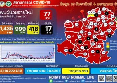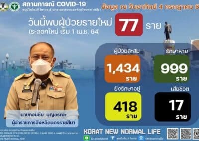นครราชสีมา – วันนี้ (4 กรกฎาคม 2564) คณะกรรมการโรคติดต่อจังหวัดนครราชสีมา ได้เปิดเผยตัวเลขผู้ติดเชื้อไวรัสโควิด-19 ในพื้นที่ จ.นครราชสีมา ล่าสุดวันนี้มีผู้ติดเชื่อรายใหม่เพิ่มขึ้น จำนวน 77 ราย ซึ่งถือว่าเป็นตัวเลขผู้ติดเชื้อวันเดียวสูงที่สุดตั้งแต่เกิดการระบาด โดยผู้ติดเชื้อรายใหม่วันนี้ แยกเป็นรายอำเภอ ได้แก่ อ.เมือง 16 ราย, อ.ปากช่อง 13 ราย, อ.โนนสูง 7 ราย, อ.บัวใหญ่ 7 ราย, อ.โชคชัย 6 ราย, อ.สีคิ้ว 6 ราย, อ.ประทาย 5 ราย, อ.โนนไทย 3 ราย, อ.คง 2 ราย, อ.ครบุรี 2 ราย, อ.ด่านขุนทด 2 ราย, อ.พระทองคำ 2 ราย, อ.ขามทะเลสอ 1 ราย, อ.ขามสะแกแสง 1 ราย, อ.เฉลิมพระเกียรติ 1 ราย, อ.ชุมพวง 1 ราย, อ.ปักธงชัย 1 ราย และ อ.พิมาย 1 ราย รวมผู้ป่วยสะสม จำนวน 1,435 ราย รักษาหายแล้ว จำนวน 999 ราย ยังรักษาอยู่ จำนวน 418 ราย และเสียชีวิต 17 ราย