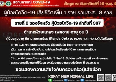 โดยผู้เสียชีวิตรายที่ 8 ของจังหวัด เป็นเพศชายอายุ 68 ปี เป็นผู้ป่วยสูงอายุที่มีภาวะแทรกซ้อน มีโรคประจำตัวเบาหวานและความดันโลหิตสูง โดยไทม์ไลน์ระบุ ว่าวันที่ 11-15 เมษายน 2564 ลูกสาวและลูกเขย เดินทางมาจากต่างจังหวัด มาอยู่ล้านหลังเดียวกับผู้สูงอายุและภรรยา มีกิจกรรมร่วมกันในครอบครัว จนเมื่อวันที่ 21 เมษายน 2564 ลูกเขยโทร.มาแจ้งว่าติดโควิด19 ผู้เสียชีวิตและภรรยาจึงรีบไปตรวจคัดกรองที่ รพ.ห้วยแถลง ตรวจพบว่าติดเชื้อ แพทย์ให้นอนรักษาที่ รพ.ห้วยแถลง ก่อนจะถูกส่งรักษาต่อที่ รพ.มหาราชนครราชสีมาในเวลาต่อมา และเสียชีวิตลงเมื่อวานนี้ (15 พฤษภาคม 2564)