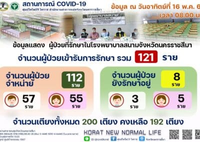 สำหรับข้อมูล รพ.สนาม มียอดสะสมผู้ป่วยเข้ารับการรักษา 112 ราย โดยรักษาหายแล้ว 112 ราย และยังพักรักษาตัวอยู่ 8 ราย แบ่งเป็นชาย 3 ราย หญิง 5 ราย คงเหลือเตียงว่างใน รพ.สนาม จำนวน 192 เตียง โดยวันนี้ มีผู้ป่วย 5 ราย เตรียมกลับบ้านได้ในวันนี้ ส่วนอีก 5 ราย อาการทั่วไปปกติ ส่งไป รพ.มหาราชนครราชสีมา ให้ครบรักษาตัว 14 วันตามเกณฑ์ ก่อนที่จะปิด รพ.สนามชั่วคราวในช่วงบ่ายนี้ แต่ยังคงเตรียมความพร้อมรองรับกับสถานการณ์ฉุกเฉินไว้ดังเดิม โดยไม่มีการย้ายของกลับ และจัดเวรบุคลากร สแตนบายไปอีกระยะหนึ่ง เพื่อให้รพ.สนาม พร้อมเปิดดำเนินงานได้ทันทีในกรณีที่สถานการณ์การระบาดรุนแรงขึ้น