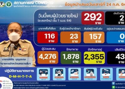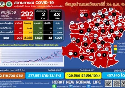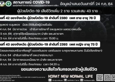 นครราชสีมา-สถานการณ์การแพร่ระบาดของโรคไวรัสโควิด 19 วันนี้ (24 กรกฎาคม 2564) ในพื้นที่จังหวัดนครราชสีมา พบว่า มีผู้ป่วยรายใหม่ จำนวน 292 ราย ซึ่งจากการสอบสวนโรค เป็นการติดเชื้อในพื้นที่จังหวัด จำนวน 135 ราย และติดเชื้อมาจากนอกพื้นที่ 157 ราย รวมมียอดผู้ป่วยสะสม จำนวน 4,276 รายแล้ว โดยรักษาหาย 1,878 ราย ยังรักษาอยู่ 2,355 ราย เสียชีวิตเพิ่ม 2 ราย รวมเสียชีวิตสะสม 43 ราย ซึ่งผู้เสียชีวิตรายที่ 42 ของจังหวัด เป็นผู้ป่วยโควิด 19 ลำดับ 2380 เพศชาย อายุ 78 ปี ชาว ต.ชุมพวง อ.ชุมพวง มีประวัติสัมผัสผู้ป่วยยืนยัน เริ่มมีอาการป่วยตั้งแต่วันที่ 14 กรกฎาคม 2564 เข้ารักษาที่ รพ.ชุมพวงและตรวจพบว่าติดเชื้อโควิด 19 จนวันที่ 23 กรกฎาคม 2564 มีอาการหอบเหนื่อยมาก จึงส่งรักษาต่อที่ รพ.มหาราชนคราชสีมา และเสียชีวิตลงในเวลา 15.00 น. ส่วนผู้เสียชีวิต รายที่ 43 ของจังหวัดฯ เป็นผู้ป่วยโควิด 19 ลำดับที่ 2393 เพศหญิงอายุ 73 ปี ซึ่งอาศัยอยู่ที่ เขตดินแดง แขวงดินแดง กรุงเทพฯ ไม่มีเตียงรักษา จึงขอประสานมารักษาตัวที่ รพ.ปากช่องนานา อ.ปากช่องเมื่อวันที่ 15 กรกฎาคม 2564 จนวันที่ 19 กรกฎาคม 2564 มีอาการหอบเหนื่อยมาก จึงนำส่งรักษาต่อที่ รพ.มหาราชนคราชสีมา และวันที่ 24 กรกฎาคม 2564 อาการไม่ดีขึ้น ได้เสียชีวิตลงในเวลา 04.20 น.