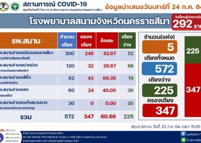 ซึ่งจากสถานการณ์การแพร่ระบาด ที่ยังทวีความรุนแรงอย่างต่อเนื่อง ทำให้จำนวนเตียงรองรับผู้ป่วยเริ่มตึง โดย รพ.ในต่างอำเภอมี 14 แห่งที่เตียงเต็มแล้ว ขณะที่เขต อ.เมืองนครราชสีมา รพ.หลัก ทั้ง 6 แห่ง พบว่า รพ.มหาราชฯ และ รพ.ป.แพทย์ เตียงเต็มแล้วเช่นกัน ส่วน รพ.เทพรัตน์ ,รพ.ค่ายสุรนารี ,รพ.มทส. และ รพ.กรุงเทพฯ ใกล้ล้น นอกจากนี้ รพ.สนามจังหวัดฯ แห่งที่ 1 และ 2 เร่งบริหารจัดการ โดยเหลือเตียงรองรับแค่ 51 เตียง จากทั้งหมด 252 เตียง ส่วน รพ.สนาม ของ อ.ปากช่อง ,อ.สีคิ้ว และ อ.คง ยังพอมีเตียงเหลือรองรับผู้ป่วยเคสสีเขียวได้ แต่ รพ.สนาม อ.แก้งสนามนาง เตียงเต็มทั้ง 30 เตียง รวมจำนวนเตียงโควิด 19 ทั้งจังหวัด คงเหลือเตียงว่างอยู่จำนวน 516 เตียง จากทั้งหมด 2,871 เตียง
