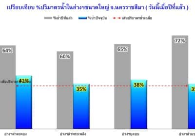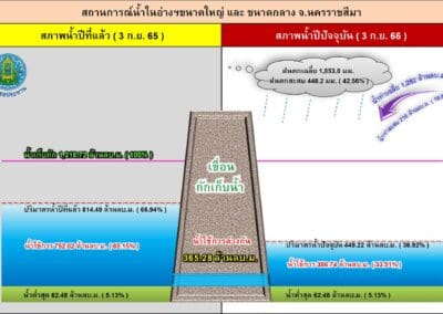 นครราชสีมา – วันนี้ (3 กันยายน 2566) ผู้สื่อข่าวรายงานว่า จากสถานการณ์ฝนที่ตกลงมาเป็นระยะในช่วงนี้ ก็ส่งผลให้มีปริมาณน้ำไหลลงอ่างเก็บน้ำต่างๆ ในพื้นที่ จ.นครราชสีมาอย่างต่อเนื่อง โดยเฉพาะอ่างเก็บน้ำขนาดใหญ่ทั้ง 4 แห่ง จากข้อมูลรายงานสถานการณ์น้ำของโครงการชลประทานจังหวัดนครราชสีมา เมื่อวานนี้ (2 ก.ย.) มีปริมาณน้ำไหลลงอ่างรวม 1.335 ล้านลูกบาศก์เมตร ประกอบไปด้วย 1.อ่างเก็บน้ำลำตะคอง อ.สีคิ้ว มีปริมาณน้ำไหลลงอ่าง 23,000 ลูกบาศก์เมตร ปัจจุบันมีปริมาณน้ำในอ่าง 129.344 ล้านลูกบาศก์เมตร คิดเป็นร้อยละ 41.13 ของความจุกักเก็บทั้งหมด 314 ล้านลูกบาศก์เมตร, 2.อ่างเก็บน้ำลำพระเพลิง อ.ปักธงชัย มีปริมาณน้ำไหลลงอ่าง 260,000 ลูกบาศก์เมตร ปัจจุบันมีปริมาณน้ำในอ่าง 53.105 ล้านลูกบาศก์เมตร คิดเป็นร้อยละ 34.73 ของความจุกักเก็บทั้งหมด 155 ล้านลูกบาศก์เมตร, 3.อ่างเก็บน้ำมูลบน อ.ครบุรี มีปริมาณน้ำไหลลงอ่าง 126,000 ลูกบาศก์เมตร ปัจจุบันมีปริมาณน้ำในอ่าง 46.485 ล้านลูกบาศก์เมตร คิดเป็นร้อยละ 34.60 ของความจุกักเก็บทั้งหมด 141 ล้านลูกบาศก์เมตร, 4.อ่างเก็บน้ำลำแชะ อ.ครบุรี มีปริมาณน้ำไหลลงอ่าง 926,000 ลูกบาศก์เมตร ปัจจุบันมีปริมาณน้ำในอ่าง 95.235 ล้านลูกบาศก์เมตร คิดเป็นร้อยละ 34.63 ของความจุกักเก็บทั้งหมด 275 ล้านลูกบาศก์เมตร ถึงอย่างไรก็ตาม ภาพรวมของปริมาณน้ำกักเก็บในอ่างเก็บน้ำขนาดใหญ่ทั้ง 4 แห่ง มีปริมาณน้ำกักเก็บรวมกัน 331.880 ล้านลูกบาศก์เมตร คิดเป็นร้อยละ 37.48 ของความจุกักเก็บทั้งหมด 885.49 ล้านลูกบาศก์เมตร ซึ่งถือว่ายังอยู่ในระดับน้อยมาก หากเปรียบเทียบกับช่วงเดียวกันเมื่อปีที่แล้ว ซึ่งมีปริมาณน้ำมากถึง 585.992 ล้านลูกบาศก์เมตร คิดเป็นร้อยละ 66.18 ของความจุกักเก็บทั้งหมด.