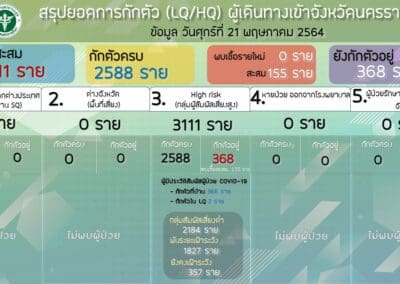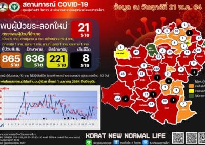 นายวิเชียร จันทรโณทัย ผู้ว่าราชการจังหวัดนครราชสีมา เปิดเผยว่า สำหรับสถานการณ์สถานการณ์การแพร่ระบาดของไวรัสโควิด-19 ในพื้นที่จังหวัดนครราชสีมา วันนี้พบผู้ติดเชื้อใหม่ 21 ราย พบในพื้นที่อำเภอเมือง 9 ราย อำเภอด่านขุนทด 4 ราย อำเภอแก้งสนามนาง 4 ราย อำเภอปักธงชัย 1 ราย อำเภอพิมาย 1 ราย อำเภอขามทะเลสอ 1 ราย และอำเภอประทาย 1 ราย รวมมียอดผู้ป่วยสะสม 865 ราย รักษาหาย 636 ราย ยังรักษา 221 ราย เสียชีวิต 8 ราย ทั้งนี้การแพร่ระบาดของโรคนั้น ยังคงพบการแพร่ระบาดจากคลัสเตอร์โรงงานกุนเชียง ขยายออกไปเป็นวงที่ 3 วงที่ 4 เช่นที่อำเภอขามทะเลสอ และจากการเดินทางมาจากพื้นที่เข้มงวดสูงสุด ที่ อ.แก้งสนาง 4 ราย นอกจากนี้ยังมีเจ้าหน้าที่ของรัฐ เป็นผู้กำกับการสถานตำรวจภูธรปักธงชัยติดเชื้อโควิด-19 ด้วย จากการปฏิบัติหน้าที่ ซึ่งขณะนี้ทางสถานีตำรวจทุกแห่งก็ได้มีการเพิ่มมาตรการมากขึ้นสำหรับเจ้าหน้าที่ที่มาปฏิบัติงานและประชาชนที่เดินทางมาติดต่อราชการ อย่างไรก็ตาม ทางจังหวัดนครราชสีมา ได้ขอพระราชทานรถชีวนิรภัย ให้มาตรวจค้นหาผู้ป่วยเชิงรุกในพื้นที่จังหวัดนครราชสีมา ทั้งประชาชน รวมทั้งผู้ต้องขังในเรือนจำ ซึ่งในวันที่ 24 พ.ค.64 นี้ รถชีวนิรภัยพระราชทาน จะเดินทางมาที่จังหวัดนครราชสีมา