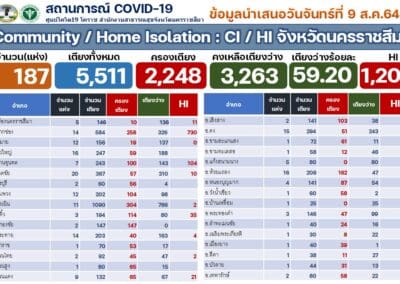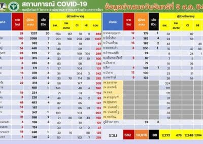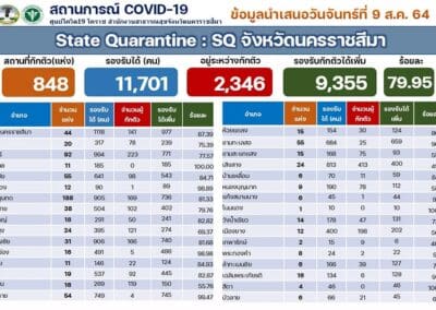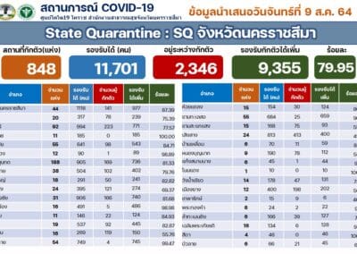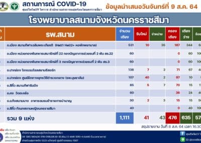 นครราชสีมา-วันนี้ (9 สิงหาคม 2564) ที่ห้องประชุมสำนักงานการท่องเที่ยวและกีฬาจังหวัดนครราชสีมา นายศักดิ์สิทธิ์ สกุลลิขเรศสีมา รองผู้ว่าราชการจังหวัดนครราชสีมา พร้อมด้วยนายแพทย์ชาญชัย บุญอยู่ รองนายแพทย์สาธารณสุขจังหวัดนครราชสีมา ร่วมกันเป็นประธานประชุมคณะกรรมโรคติดต่อจังหวัดนครราชสีมา พร้อมแถลงถึงสถานการณ์การแพร่ระบาดของเชื้อไวรัสโควิด-19ในพื้นที่จังหวัดนครราชสีมา โดยในที่ประชุมฯ รายงานสถานการณ์ล่าสุด ว่า พบผู้ป่วยรายใหม่ จำนวน 562 ราย เสียชีวิตเพิ่ม 5 ราย แยกเป็นผู้ป่วยมาจากพื้นที่เสี่ยง 250 ราย รับผู้ป่วยเข้ามารักษา 42 ราย สัมผัสผู้ป่วยยืนยัน 270 ราย รวมในพื้นที่จังหวัดนครราชสีมา มีผู้ป่วยสะสม 10,915 ราย รักษาหายแล้ว 4,630 ราย ยังรักษาอยู่ 6,199 ราย เสียชีวิตรวม 86 ราย
