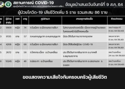 สำหรับผู้ป่วยเสียชีวิตรายใหม่ ทั้ง 5 ราย รายแรก เป็นเพศหญิง อายุ 74 ปี ชาว ต.ในเมือง อ.เมืองนครราชสีมา สาเหตุการติดเชื้อ ไม่ทราบแหล่งแพร่เชื้อ เนื่องจากอยู่บ้านตลอด ในครอบครัวไม่มีใครพบเชื้อ , รายที่ 2 เป็น ชาย อายุ 57 ปี ชาว ต.หนองบุญมาก อ.หนองบุญมาก มีประวัติเดินทางมาจากกรุงเทพ , รายที่ 3 เป็น หญิง อายุ 66 ปี ชาว ต.ในเมือง อ.เมืองนครราชสีมา มีประวัติสัมผัสผู้ป่วย COVID-19 , รายที่ 4 เป็นชาย อายุ 56 ปี ชาว ต.โคกกระเบื้อง อ.บ้านเหลื่อม ประวัติเดินทางกลับมาจาก อ.บางพลี จ.สมุทรปราการ และรายที่ 5 เป็นหญิง อายุ 46 ปี ชาว ต.ช่อระกา อ.บ้านเหลื่อม ประวัติเดินทางกลับมาจาก อ.ปลวกแดง จ. ระยอง