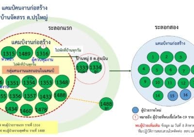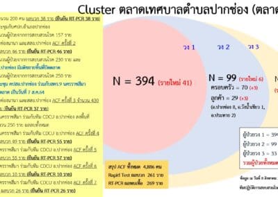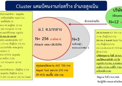 1.คลัสเตอร์แคมป์คนงานก่อสร้าง โครงการบ้านจัดสรร ต.ปรุใหญ่ พบการระบาดถึง 2 ระลอก เริ่มจากผู้ติดเชื้อ รายแรก เป็นโฟร์แมนควบคุมงานก่อสร้าง แพร่เชื้อไปยังหัวหน้า หัวหน้าคนงาน กลุ่มคนงานในแคมป์ และภรรยากับลูกงาน รวมมีผู้ติดเชื้อระลอกแรก 19 ราย จากนั้นเกิดการระบาด ภายในแคมป์งานก่อสร้างเป็นระลอกที่ 2 ทำให้มีผู้ติดเชื้อรายใหม่เพิ่มอีก 16 ราย