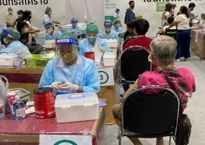 นครราชสีมา – วันนี้ (23 กรกฎาคม 2565) เวลา 13.00 น. ที่จุดฉีดวัคซีนโรงพยาบาลมหาราชนครราชสีมา หน้าโรงภาพยนตร์ SFX CINEMA ชั้น 4 ศูนย์การค้าเซ็นทรัลพลาซ่านครราชสีมา ได้มีประชาชนเดินทางมารับการฉีดวัคซีนไฟเซอร์กันอย่างคึกคัก ภายหลังจากที่โรงพยาบาลมหาราชนครราชสีมา ได้เปิดให้ประชาชนทุกวัย สามารถวอล์คอินเข้ามาฉีดวัคซีนไฟเซอร์ฟรี โดยเฉพาะวัคซีนเข็มกระตุ้น ตั้งแต่เข็มที่ 3 ขึ้นไป เพื่อให้เป็นไปตามเป้าหมายของจังหวัดนครราชสีมา ที่เร่งดำเนินการฉีดวัคซีนเข็มกระตุ้นให้ได้ถึงร้อยละ 60 ของประชากรกลุ่มเป้าหมายในพื้นที่ กว่า 2.6 ล้านคน ก่อนที่จะเข้าสู่การประกาศให้ไวรัสโควิด-19 เป็นโรคประจำถิ่น ซึ่งล่าสุดวันนี้ จ.นครราชสีมา สามารถฉีดวัคซีนให้กับประชาชนไปแล้ว จำนวน 4,836,123 โดส โดยแบ่งเป็น เข็มที่ 1 ฉีดไปแล้ว จำนวน 2,073,332 โดส คิดเป็นร้อยละ 78.74 เข็มที่ 2 ฉีดไปแล้ว จำนวน 1,920,546 โดส คิดเป็นร้อยละ 72.94 และเข็มที่ 3 หรือเข็มกระตุ้น ฉีดไปแล้ว จำนวน 842,245 โดส คิดเป็นร้อยละ 31.99
