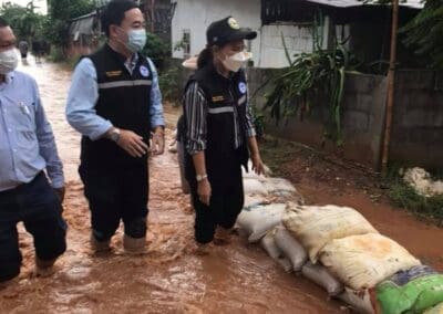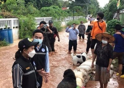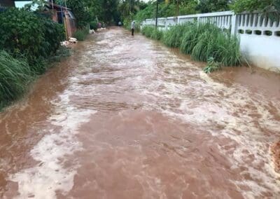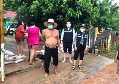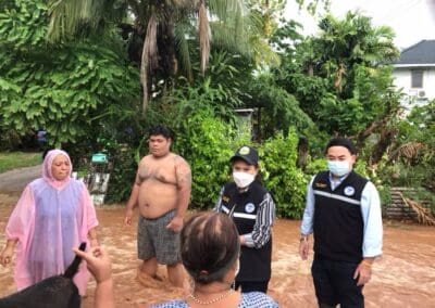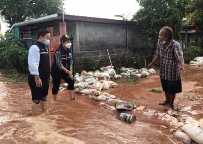 (ภาพ 2) ในขณะที่เขตอำเภอเมืองนครราชสีมา ที่ชุมชนโสฬส ตำบลปรุใหญ่ ฝนตกหนักทำให้เกิดน้ำท่วมขังไหลหลากเข้าบ้านเรือนประชาชน นางฉมามาศ อินทรักษา หรือ “นายกต้อม” นายกเทศมนตรีตำบลปรุใหญ่ พร้อมด้วยผู้นำชุมชน และ เจ้าหน้าที่ป้องกันและบรรเทาสาธารณภัยเทศบาลตำบลปรุใหญ่ รุดลงพื้นที่ตรวจสภาพปัญหาเพื่อให้การช่วยเหลือประชาชนเป็นการเร่งด่วน เนื่องจากสภาพน้ำที่ท่วมขังรอระบาย บางจุดมีระดับสูงเกือบ 20 เซนติเมตร และไหลหลากเข้าบ้านเรือน ส่วนเส้นทางสัญจรในรอกในซอยก็ท่วมเจิ่ง ทำให้สัญจรลำบาก สร้างความเดือดร้อนให้กับประชาชนในพื้นที่อย่างมาก นอกจากนี้ บางจุดยังท่วมขังซ้ำซาก จำเป็นต้องบูรณาการกับพื้นที่ข้างเคียง ร่วมช่วยเหลือประชาชน แก้ปัญหาน้ำท่วมให้หมดสิ้นไปโดยเร็ว ก่อนที่สถานการณ์จะแย่ลง ทำให้ประชาชนเดือดร้อนไปมากกว่านี้