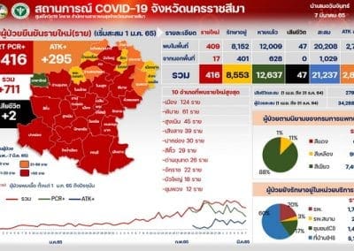 ด้านคณะกรรมการโรคติดต่อจังหวัดนครราชสีมา ได้เปิดเผยถึงสถานการณ์การระบาดของไวรัสโควิด-19 ล่าสุด วันนี้ (7 มี.ค. 65) พบว่ามีผู้ติดเชื้อรายใหม่เพิ่มขึ้น จำนวน 711 ราย โดยแบ่งเป็นผู้ติดเชื้อจากผลการตรวจ ATK จำนวน 295 ราย และผลจากการตรวจ RT PCR จำนวน 416 ราย มีผู้เสียชีวิต 2 ราย ส่งผลให้ขณะนี้มีผู้ติดเชื้อระลอกใหม่สะสมแล้ว จำนวน 34,288 ราย รักษาหายแล้ว จำนวน 12,637 ราย ยังรักษาอยู่ จำนวน 8,553 ราย เสียชีวิต จำนวน 47 ราย.