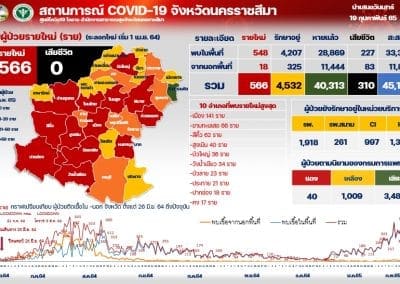 นครราชสีมา-วันนี้ (19 กุมภาพันธ์ 2565) ตัวเลขผู้ติดเชื้อโควิด 19 รายใหม่ของจังหวัดนครราชสีมา ยังเพิ่มสูง อยู่ที่ 566 ราย ซึ่งเป็นการติดเชื้อในพื้นที่จังหวัด 548 ราย และติดมาจากนอกจังหวัด 18 ราย โดยอำเภอ 5 อันดับแรกที่พบผู้ติดเชื้อรายใหม่มากสุด คือ อำเภอเมืองนครราชสีมา จำนวน 141 ราย , อำเภอขามทะเลสอ 66 ราย , อำเภอสีคิ้ว 62 ราย , อำเภอสูงเนิน 40 ราย และ อำเภอบัวใหญ่ 36 ราย ขณะที่พื้นที่ 32 อำเภอของจังหวัดนครราชสีมา ในห้วง 1 สัปดาห์ ตั้งแต่วันที่ 7-13 กุมภาพันธ์ 2565 พบว่า เป็นพื้นที่สีแดง มีผู้ติดเชื้อมากกว่า 50 ราย อยู่ถึง 13 อำเภอ , พื้นที่สีส้ม ผู้ติดเชื้อมากกว่า 21-50 ราย มีอยู่ 7 อำเภอ ,พื้นที่สีเหลือง ผู้ติดเชื้อมากกว่า 1-20 ราย มี 11 อำเภอ และพื้นที่สีเขียว ไม่มีผู้ติดเชื้อ มีแค่ 1 อำเภอเท่านั้น คือ อำเภอลำทะเมนชัย รวมยอดผู้ติดเชื้อสะสมของจังหวัด อยู่ที่ 45,155 ราย ทั้งนี้ รักษาหายแล้ว 40,313 ราย เสียชีวิต 310 ราย และยังรักษาตัวอยู่ 4,532 ราย โดยแยกเป็นผู้ป่วยเคสสีแดง 40 ราย เคสสีเหลือง 1,009 ราย และเคสสีเขียว 3,483 ราย