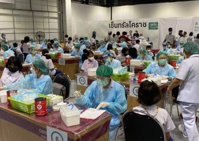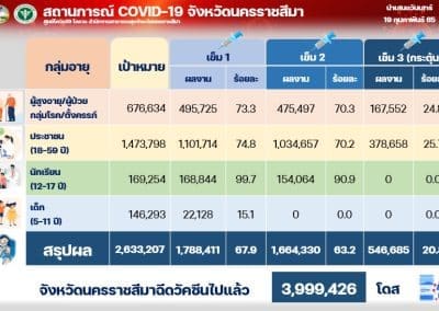 สำหรับมาตรการป้องกันเชิงรุก ด้วยการฉีดวัคซีนป้องกันโควิด 19 ให้ประชาชนเป้าหมาย จำนวน 2,633,207 ราย พบว่า กลุ่มเป้าหมายที่เป็นกลุ่ม 608 ผู้สูงอายุ , ผู้ป่วย 7 กลุ่มโรคเรื้องรังและหญิงตั้งครรภ์12 สัปดาห์ขึ้นไป ซึ่งมีเป้าหมายอยู่จำนวน 676,634 ราย พบว่า ฉีดเข็ม 1 แล้ว 495,725 ราย หรือ 73.3 % ,เข็ม 2 ฉีดได้ 475,497 ราย หรือ 70.3 % และเข็ม 3 กระตุ้น ฉีดแล้ว 167,552 ราย หรือ 24.8 %เท่านั้น ส่วนกลุ่มประชาชนทั่วไป อายุ 18 – 59 ปี มีเป้าหมายอยู่จำนวน 1,473,798 ราย ตอนนี้ฉีดเข็ม 1 ได้ 1,101,714 ราย หรือ 74.8 % เข็ม 2 ฉีดได้ 1,034,657 ราย หรือ 70.2% เข็ม 3 ฉีดได้ 378,658 ราย หรือ 25.7 % และในกลุ่มนักเรียน อายุ 12-17 ปี เป้าหมายจำนวน 169,254 ราย ฉีดเข็ม 1 ไปแล้ว 168,844 ราย หรือ 99.7 % เข็ม 2 ฉีดแล้ว 154,064 ราย หรือ 90.9 % และยังไม่มีนักเรียนได้ฉีดเข็ม 3 ขณะที่เด็กเล็ก 5-11 ปี เป้าหมายมีอยู่ 146,293 ราย เพิ่งได้ฉีดเข็ม 1 จำนวน 22,128 ราย หรือ 15.1 % เท่านั้น สรุปรวมฉีดวัคซีนไปแล้ว จำนวน 3,999,426 โดส โดยเป็นการฉีดเข็ม 1 ให้กับประชาชนเป้าหมายไปจำนวน 1,788,411 ราย หรือคิดเป็น 67.9% , วัคซีนเข็ม 2 ฉีดไป 1,664,330 ราย หรือคิดเป็น 63.2 % และวัคซีนเข็ม 3 ฉีดไป 546,685 ราย คิดเป็น 20.8 % ซึ่งจะเห็นได้ว่า ยอดการฉีดวัคซีนเข็ม 3 กระตุ้นยังดำเนินการได้ช้าจากหลายๆ สาเหตุ ในขณะที่มีประชาชนทั่วไปจำนวนมากในจังหวัดที่ฉีดเข็ม 3 แล้ว ต่างถามหาเข็ม 4 เนื่องจากครบกำหนดจะต้องได้รับเข็ม 4 กระตุ้นแล้ว เกรงจะไม่เหลือภูมิป้องกันโควิด 19 แต่ทางสถานพยาบาลยังไม่เปิดบริการฉีดเข็ม 4 ให้ ต้องให้บริการเข็ม 4 แก่กลุ่ม 608 และบุคลากรทางการแพทย์ก่อน .