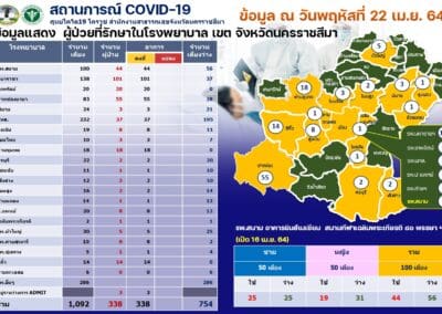สำหรับจำนวนเตียงตามโรงพยาบาลต่างๆ ในพื้นที่จังหวัดนครราชสีมา ทั้ง32 อำเภอ สามารถรองรับผู้ป่วยได้ จำนวน 1,092 เตียง มีผู้ป่วยนอนพักรักษาตัว 338 เตียง จำนวนตียงว่าง 754 เตียง ส่วนในโรงพยาบาลสนาม ภายในอาคารชาติชาย ฮอลล์ สนามกีฬาเฉลิมพระเกียรติ 80 พรรษา สามารถรองรับผู้ป่วยได้ จำนวน 100 เตียง ขณะนี้มีผู้ป่วยเข้ารักษาแล้ว จำนวน 44 ราย