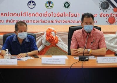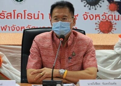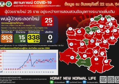 นครราชสีมา-วันนี้ (22 เมษายน 2564) ที่ห้องประชุมชั้น 1 สำนักงานการท่องเที่ยวและกีฬาจังหวัดนครราชสีมา นายวิเชียร จันทรโณทัย ผู้ว่าราชการจังหวัดนครราชสีมา พร้อมด้วยนายกรกต ธำรงวงศ์สวัสดิ์ รองผู้ว่าราชการจังหวัดฯ พร้อมด้วย พญ.อารีย์ เชื้อเดช รองนายแพทย์สาธารณสุขจังหวัดฯ ร่วมกันประชุมคณะกรรมการโรคติดต่อจังหวัดฯ เพื่อควบคุมการแพร่ระบาดของเชื้อไวรัสโควิด-19ในพื้นที่จังหวัดนครราชสีมา ซึ่งล่าสุดในพื้นที่จังหวัดพบผู้ป่วยเพิ่ม จำนวน 25 ราย ตรวจพบในพื้นที่ อ.เมืองนครราชสีมา 4 ราย , อ.ปากช่อง 2 ราย ,อ.สีคิ้ว 1 ราย , อ.ปักธงชัย 1 ราย , อ.ห้วยแถลง 1 ราย , อ.บัวใหญ่ 4 ราย ,อ.ประทาย 3 ราย , อ.สีดา 1 ราย , อ.ด่านขุนทด 2 ราย , อ.ลำทะเมนชัย 1 ราย , อ.คง 1 ราย , อ.สูงเนิน 2 ราย ,อ.จักราช 1 ราย และ อ.พิมาย อีก 1 ราย รวมมียอดผู้ป่วยสะสม 353 ราย รักษาหาย 15 ราย ยังคงรักษาตัวในโรงพยาบาล 338 ราย
