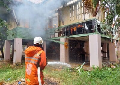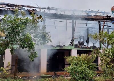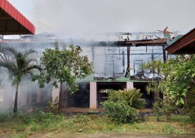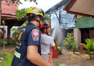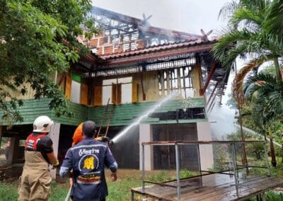 นครราชสีมา-เมื่อเวลา 10.30น. วันนี้ (6 กรกฏาคม 2564) หน่วยกู้ภัยสว่างเมตตานครราชสีมา ได้รับแจ้งจากประชาชนว่า มีเหตุเพลิงไหม้วัดหนองกระทุ่ม ต.หนองกระทุ่ม อ.เมืองนครราชสีมา จ.นครราชสีมา จึงจัดทีมอาสากู้ภัย พร้อมรถอุปกรณ์ดับเพลิง 1 คัน และรถพยาบาล 3 คัน ไปตรวจสอบที่เกิดเหตุ พร้อมกันนี้ ได้ประสานขอรับการสนับสนุนรถน้ำดับเพลิง จาก อบต.บ้านเกาะ , อบต.หนองกระทุ่ม , เทศบาลนครนครราชสีมา และองค์การบริหารส่วนจังหวัดนครราชสีมา รวมจำนวน 5 คัน เข้าร่วมระงับเหตุ โดยจุดเกิดเหตุ พบเพลิงกำลังลุกไหม้ศาลาการเปรียญของวัดหนองกระทุ่ม จึงรีบนำกำลังช่วยกันฉีดน้ำสกัดเพลิงเอาไว้ แต่เนื่องจากศาลาดังกล่าว เป็นศาลาไม้ 2 ชั้น จึงเป็นเชื้อเพลิงติดไฟได้อย่างดี ทำให้เพลิงลุกไหม้อย่างรวดเร็วศาลาการเปรียญเสียหายทั้งหลัง