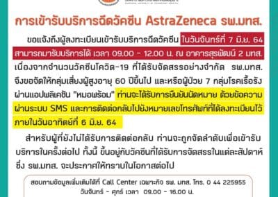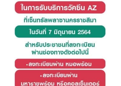 ทั้งนี้นายแพทย์เจษฎ์ บุญยวงศ์วิโรจน์ รองผู้อำนวยการโรงพยาบาลมหาราชนครราชสีมา ได้ไลฟ์สดผ่านเพจ “โรงพยาบาลมหาราชนครราชสีมา” ชี้แจงว่า เนื่องด้วยจำนวนวัคซีน AstraZeneca ที่ได้รับมาในวันที่ 7 – 19 มิถุนายน 2564 มีจำนวนจำกัด โดยได้รับการจัดสรรมาให้เพียง 3 กลุ่มๆ ละ 600 คน ทางโรงพยาบาลมหาราชนครราชสีมา ได้ให้ความสำคัญกับประชาชนทุกท่านที่ลงทะเบียนรับวัคซีน ผ่านทั้ง 3 ช่องทางอย่างเท่าเทียมกัน ดังนั้นคณะกรรมการบริหารการฉีดวัคซีนโรงพยาบาลมหาราชนครราชสีมา จึงจะพิจารณาตามความเหมาะสม โดยจะพิจารณาจากกลุ่มเสี่ยง ผู้ที่มีอายุ 60 ปีขึ้นไป หรือผู้ป่วย 7 กลุ่มโรคเรื้อรัง เรียงลำดับตามวันและเวลาที่ท่านลงทะเบียน ทั้งนี้สำหรับ 3 กลุ่มที่จะได้รับการฉีดวัคซีนในวันที่ 7 มิถุนายน 2564 นี้ ประกอบไปด้วย ได้แก่ กลุ่มที่ 1 ผู้ที่ลงทะเบียนผ่าน รพ.สต.ที่โรงพยาบาลมหาราชนครราชสีมา รับดูแลอยู่ ได้แจ้งไปที่ รพ.สต.ไปแล้ว จำนวน 600 คน กลุ่มที่ 2 ผู้ที่ลงทะเบียนผ่านแอพลิเคชั่นหมอพร้อม ซึ่งจะเรียงตามลำดับที่ลงทะเบียนจอง 600 คน และกลุ่มที่ 3 ผู้ที่ลงทะเบียนผ่านแอพชิเคชั่นมหาราชพร้อม ซึ่งก็จะเรียงตามลำดับที่ลงทะเบียนจองไว้ 600 คนแรก โดยทางโรงพยาบาลมหาราชนครราชสีมาจะทำการแจ้งรายชื่อและวันเวลาที่นัดมาฉีดให้ทราบภายในวันที่ 6 มิถุนายน 2564 ทางโรงพยาบาลมหาราชนครราชสีมาต้องขออภัยสำหรับท่านที่ลงทะเบียน และไม่ได้รับคัดเลือกในรอบแรก