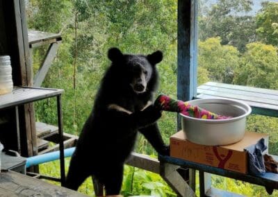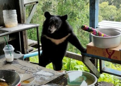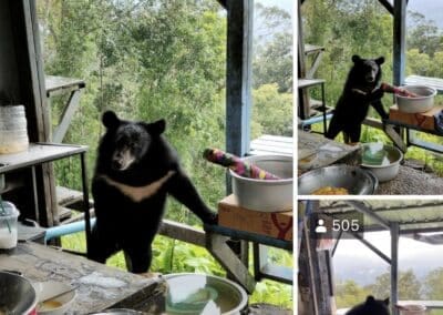 ส่วนเจ้าหมีก็ยังไม่ละความพยายาม ดึงดันเดินมาเกาะที่โต๊ะหวังจะคว้าหม้อข้าวไปให้ได้ จนชนขวดน้ำมันพืชหกกระจาย ก่อนที่จะเกิดเป็นภาพการยื้อแย่งหม้อข้าวระหว่างคนกับหมี แม้ว่าแม่ค้าจะกลัว แต่ก็ไม่ยอมให้เจ้าหมีขโมยข้าวไปกิน ซึ่งทุกคนที่อยู่ในเหตุการณ์ต่างวุ่นวายเอาใจช่วยแม่ค้า แต่ก็ห่วงน้องหมีจะได้รับอันตรายจากกระทะที่ร้อน นับเป็นภาพน่ารักและน่าประทับใจในความพยายามของเจ้าหมี ที่ชาวโซเชียลต่างเข้ามาชื่นชม แต่ขณะเดียวกันก็เตือนแม่ค้าให้ระมัดระวังอันตรายที่อาจเกิดขึ้นได้ ควรแจ้งเจ้าหน้าที่อุทยานฯ ให้หาแนวทางป้องกันแก้ไข และให้จัดเก็บข้าวของให้ดี โดยเฉพาะการประกอบอาหาร อย่าโยนหรือทิ้งเศษอาหารของกินต่างๆ ลงป่า เพราะจะทำให้สัตว์ป่าตามกลิ่นเข้ามารื้อค้นหาของกินอีกได้