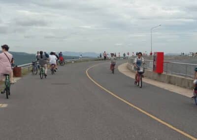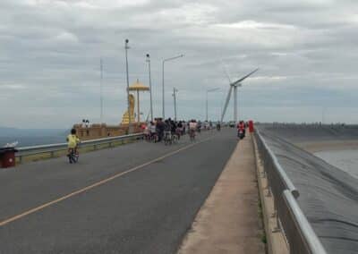 นครราชสีมา – วันที่ 30 กรกฎาคม 2566 ผู้สื่อข่าวรายงาน บรรยากาศท่องเที่ยวที่ จังหวัดนครราชสีมา ช่วงวันหยุดยาวระหว่างวันที่ 28 ก.ค.-2ส.ค. 66 นักท่องเที่ยว เดินทางไปเขายายเที่ยง ตำบลคลองไผ่ อำเภอสีคิ้ว จังหวัดนครราชสีมา เพื่อเซลฟี่กับกังหันลมยักษ์ 12 ต้น บนยอดเขา ซึ่งการไฟฟ้าฝ่ายผลิตแห่งประเทศไทยได้นำมาติดตั้งไว้ผลิตกระแสไฟฟ้า และยังเปิดให้นักท่องเที่ยวได้เข้ามาเที่ยวชม สัมผัสอากาศบริสุทธิ์ และปั่นจักรยานกินลมชมวิว บริเวณอ่างเก็บน้ำตอนบนของยอดเขายายเที่ยง