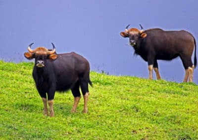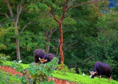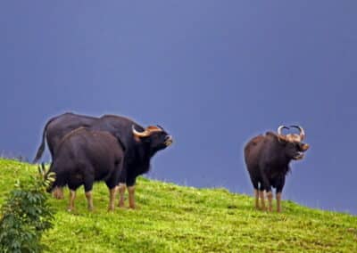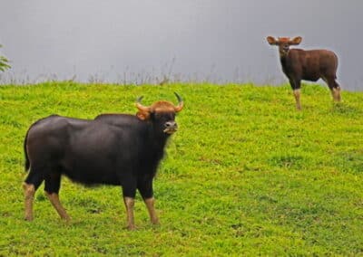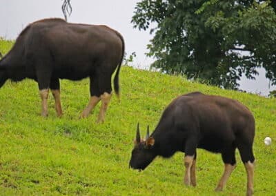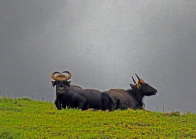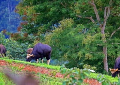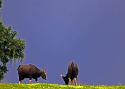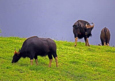 แต่วันนี้ ได้เห็นใกล้ พอสมควร เสียดายที่ฝนเตือนให้ เราต้องรีบขึ้นมา ก่อนฝนจะเทลงมาห่าโตๆ กระทิง ฝูงนี้ ประมาณ 30 ตัว มีจ่าฝูง นำทีม ออกมาเล็มหญ้า เดินทอดน่อง ไปเลาะรั้วไฟฟ้าด้านเนินเขา กระทิง เป็นสัตว์ป่า ที่รักสงบ เคี้ยวเอื้อง กินอาหารวันหนึ่ง เกือบ ร้อยกิโล ทุ่งหญ้าในอุทยานปีนี้ อุดมสมบูรณ์ พื้นที่กระจาย แยกฝูง กันออกไป อย่างกระจัดกระจาย จนบางครั้ง เขตุหากิน เข้าใกล้ ถึง ถนน 304 บางวันอาจเห็นกระทิงมาเล็มหญ้า ริมถนน