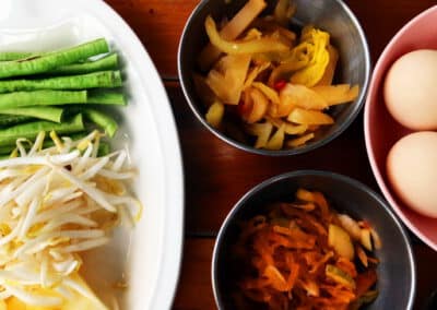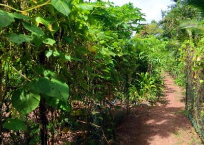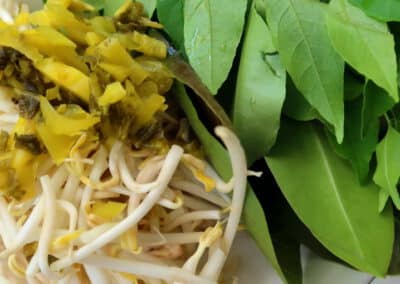 บนพื้นที่กว่า 3 ไร่ ที่เป็นแนวยาว กว่า 200 เมตร เมื่อ 8 ปีที่ผ่านมา คุณพ่อ แบ่งพื้นที่ใช้ปลูกผักถึง 70 เปอร์เซนต์ ทำให้ ลูกค้าสามารถเข้าไปชมสวนผัก พื้นท้องถิ่นของภาคใต้ได้ ก่อนหรือหลัง กินขนมจีน นำยาจะมีนำยาพื้นบ้าน ไตปลา น้ำพริก แกงเขียวหวาน ที่เด็ดที่สุดคือ น้ำยาปู ซึ่งจะเข้มข้น ออกรสชาดหวานจากธรรมชาติ ปูจะสดๆทุกวัน เสริฟพร้อมกัน ทอดมันปลา หมูฮ้อง (คล้ายพะโล้) หมูทอด เป็นอาหารท้องถิ่นของคนภูเก็ต
