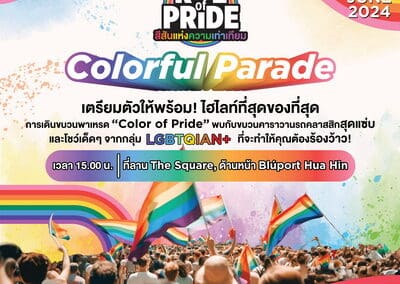 เชิญชวนทุกท่านมาร่วมเป็นส่วนหนึ่งของความภาคภูมิใจไปด้วยกัน ในบรรยากาศสนุกสุดมันส์ ร่วมเฉลิมฉลองไปกับขบวนพาเหรด “COLOR OF PRIDE 2024” ปิดท้ายเทศกาล Pride Month กับงาน Bluport Rise of Pride ครั้งแรกในเมืองหัวหิน ในวันที่ 29 มิถุนายนนี้ เวลา 15.00 น. ที่ ลาน เดอะสแควร์ บลูพอร์ต หัวหิน