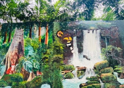 นครราชสีมา-วันนี้ ( 26 พฤศจิกายน 2566 ) ที่สวนซ่อนศิลป์ 44 หมู่ 7 ต.กลางดง อ.ปากช่อง จ.นครราชสีมา นายสุรินทร์ สนธิระติ (คนสร้างป่า) เจ้าของสวนซ่อนศิลป์ เตรียมเปิดตัวงานศิลปะสีน้ำอะคริลิคขนาดใหญ่ที่สุดของประเทศไทย บอกเรื่องเล่าของธรรมชาติป่าเขาใหญ่ ผ่านสัตว์ป่านานาชนิด อย่างเช่น ช้าง นกเงือก กวาง ชะนี กระทิง แมวดาว สุนัขจิ้งจอก รวมไปถึง จุดสำคัญบนผืนป่ามรดกโลก น้ำตกเหวสุวัต โป่งดิน และทุ่งหญ้าหนองผักชี เป็นต้น โดยผลงานดังกล่าว มีศิลปินวาดรูป อดีตครูศิลปะโคราชชื่อดัง อาทิ อาจารย์ วีระยุทธ เพชรประไพ หรือครูไก่ อดีตครูศิลปะโรงเรียนเสิงสาง อ.เสิงสาง จ.นครราชสีมา , อาจารย์สุริชัย ศิริบูรณ์ หรือครูแดง อดีตครูศิลปะโรงเรียนธารปราสาทเพชรวิทยา อ.โนนสูง จ.นครราชสีมา และครูเฟิร์น อารดา เคนผาพงศ์ มาช่วยกันรังสรรค์งานศิลปะเอาไว้ในผลงานชิ้นนี้