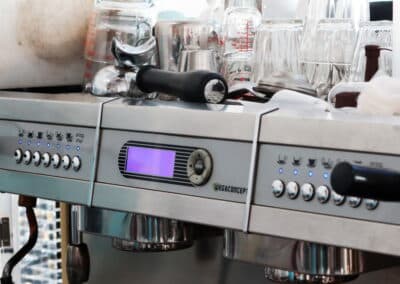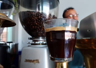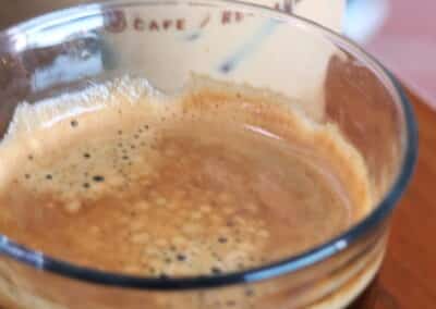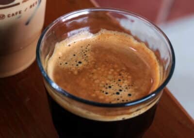 อเมริกาโน่ สูตร เข้ม สำหรับ คอกาแฟตัวยง ต้องไม่มีน้ำตาลปน พิสูจน์ ว่าเข้มสมใจ หรือเปล่า ลาเต้ที่เจ้าของร้านบอกว่า ใช้นมสดทุกวัน ไม่ทิ้งค้าง ปรุงใหม่แก้ชนแก้ว เครื่องคลั้นกาแฟมาตรฐานราคาสองแสนกว่า แต่มานั่ง เก็บเงินแค่ 45 บาทต่อแก้ว ท้าชน กาแฟร้านสะดวกซื้อ พิสูจน์ ช๊อตต่อช๊อต