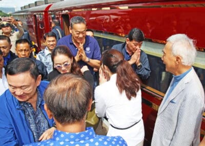 13 ธ.ค. 2567 เมื่อเวลา 12.00 น. ผู้สื่อข่าวรายงาน ว่า นายสุวัจน์ ลิปตพัลลภ อดีตรองนายกรัฐมนตรี ประธานพรรคชาติพัฒนา คุณพราวพุธ ลิปตพัลลภ กรรมการบริหาร บริษัท พราว เรียล เอสเตท พร้อมด้วยพี่น้องประชาชนหัวหิน จำนวนมาก มาต้อนรับ น.ส.แพทองธาร ชินวัตร นายกรัฐมนตรี ในฐานะหัวหน้าพรรคเพื่อไทย นายทักษิณ ชินวัตร อดีตนายกรัฐมนตรี พร้อมสมาชิกพรรคเพื่อไทย เดินทางด้วยขบวนรถไฟพิเศษ จากสถานีหัวลำโพงถึงสถานีหนองแก อ.หัวหินจ.ประจวบคีรีขันธ์ ในการมาสัมมนา ตามโครงการเสริมศักยภาพ สส. และบุคลากรทางการเมือง ระหว่างวันที่ 13 – 14 ธ.ค.ที่ โรงแรมอินเตอร์คอนติเนนตัล หัวหิน รีสอร์ท