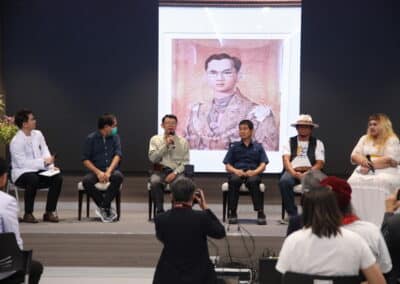สำหรับงานนิทรรศการภาพถ่าย “กษัตริย์ คู่ ราษฎร” The King loves Thais จัดขึ้นโดยอาศัยความร่วมมือระหว่างคณะแพทยศาสตร์ศิริราชพยาบาล ม.มหิดล กับมูลนิธิ เก้า ยั่งยืน ในรูปแบบการแสดงคุณค่าของงานศิลปะจากภาพถ่าย ภาพจิตรกรรม ประติมากรรม ดนตรี และบทกวี ทั้งนี้ได้รับเกียรติจากศิลปินแห่งชาติหลากหลายวงการร่วมส่งผลงานจัดแสดง อาทิ นายอำมฤทธิ์ ชูสุวรรณ ศิลปินแห่งชาติ สาขาทัศนศิลป์ นายวรนันทน์ ชัชวาลทิพากร ศิลปินแห่งชาติ ด้านภาพถ่าย นายธีรภาพ โลหิตกุล ศิลปินแห่งชาติ สาขาวรรณศิลป์ (สารคดี) คุณไพบูลย์ มุสิกโปดก ศิลปินแห่งชาติ สาขาทัศนศิลป์ (ภาพถ่ายศิลปะ) พร้อมด้วยศิลปินกิตติมศักดิ์ นายชวน หลีกภัย อดีตนายกรัฐมนตรี และ