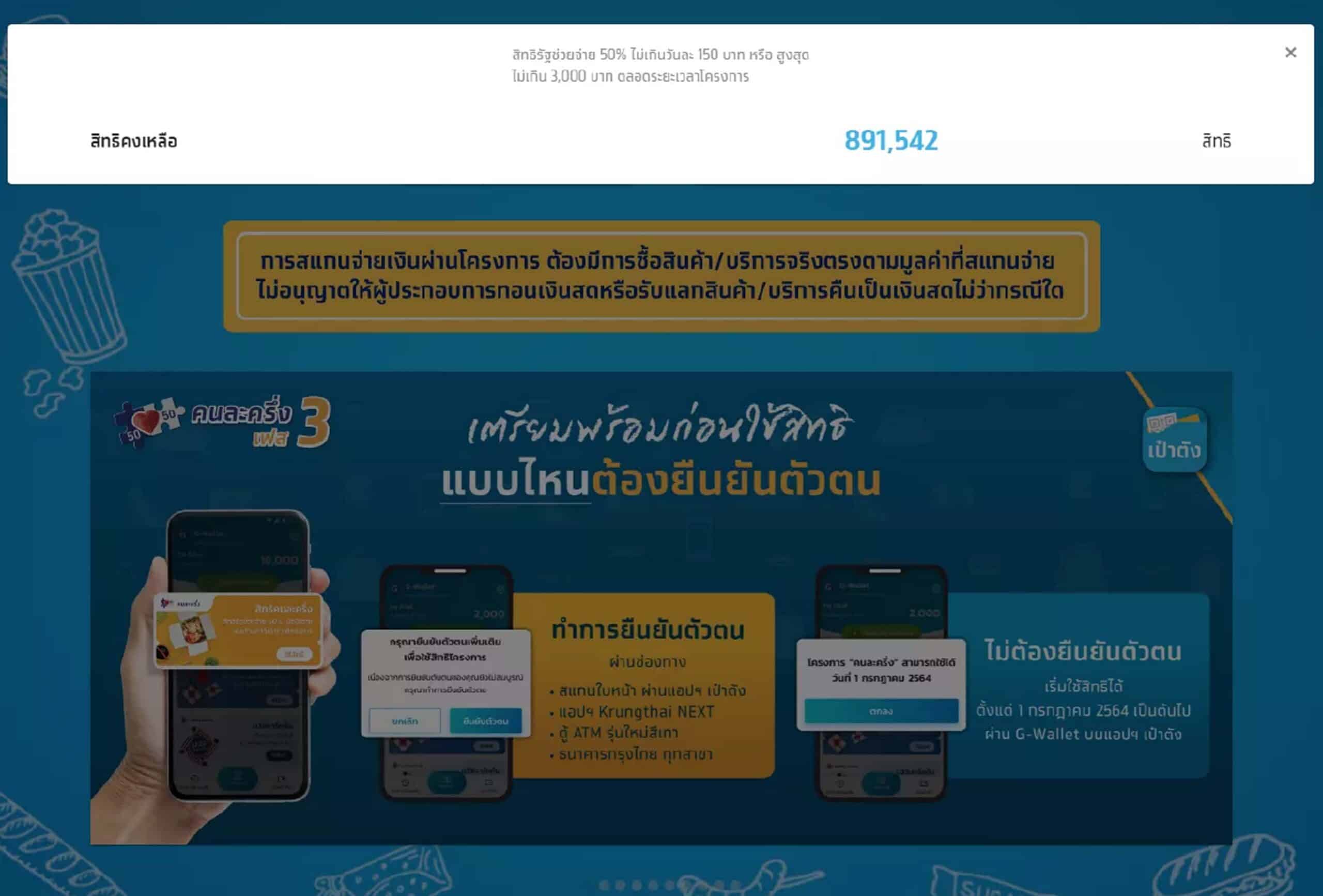 ข้อมูลล่าสุด www.คนละครึ่ง.com : คลิกที่นี่ ณ วันที่ 6 กันยายน 2564 เวลา 14.00 น. พบ สิทธิคงเหลือ 891,542 สิทธิ จากที่เปิดให้ลงทะเบียนทั้งผู้ที่เคยเข้าร่วมโครงการในระยะที่ 1 (เฟส 1) ระยะที่ 2 (เฟส 2) และผู้ที่ยังไม่เคยเข้าร่วมโครงการ รวม 31 ล้านสิทธิ