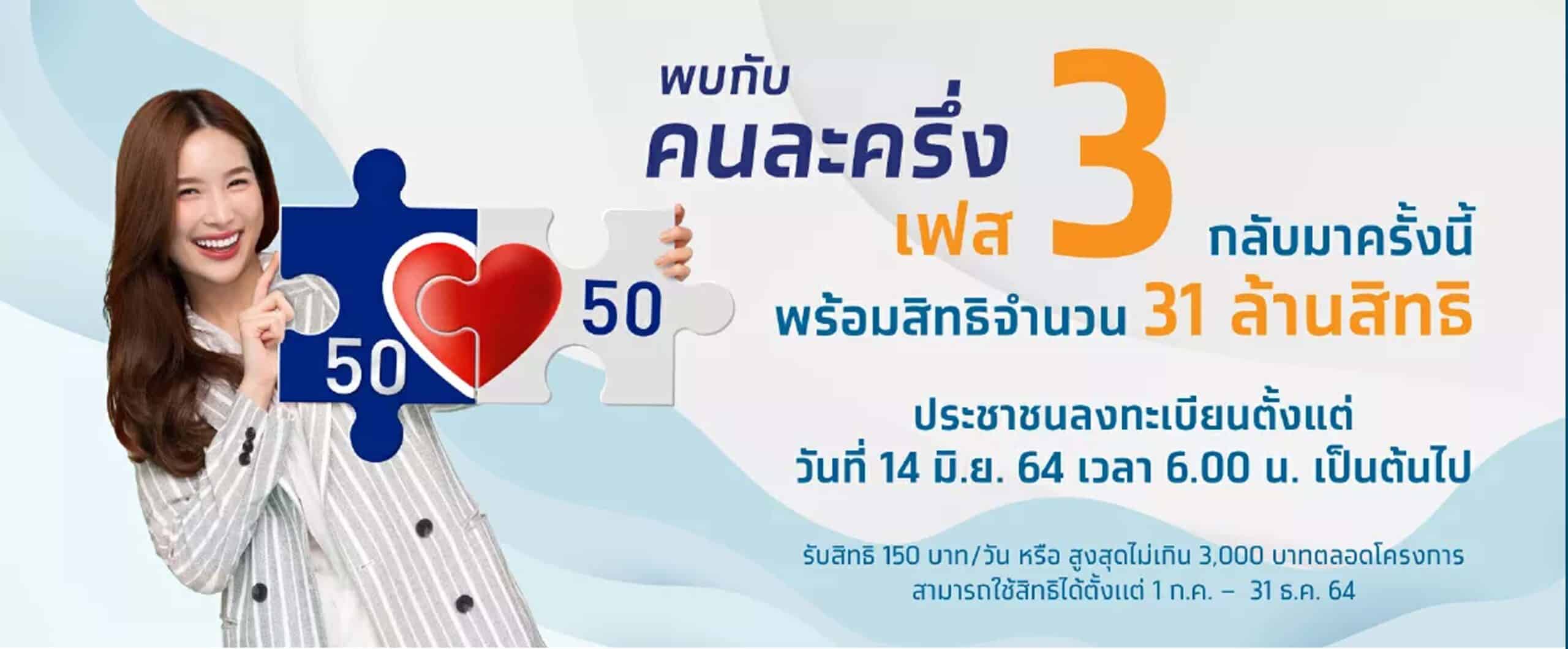 โครงการ “คนละครึ่งเฟส 3” ให้สิทธิใช้จ่ายไม่เกิน 150 บาทต่อวัน (รัฐช่วยจ่าย 50% : ผู้ได้สิทธิจ่าย 150 บาท) รวมวงเงิน 3,000 บาท ตลอดระยะเวลาโครงการ แบ่งการจ่ายออกเป็น 2 รอบ