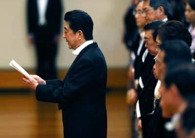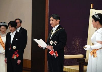 ด้านนายกรัฐมนตรีญี่ปุ่น นายชินโซ อาเบะ กล่าวคำแถลงในฐานะตัวแทนของประชาชนว่า ประชานชาวญี่ปุ่นรู้สึกยินดีอย่างสุดซึ้งที่จักรพรรดิพระองค์ใหม่ทรงขึ้นครองราชย์ และรัฐบาลจะพยายามทำให้ญี่ปุ่นเป็นประเทศที่มีความสันติ