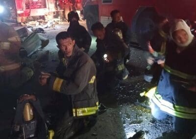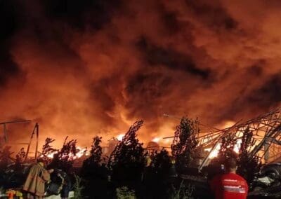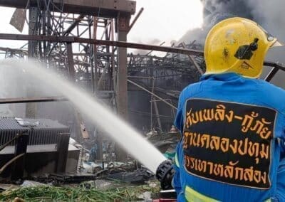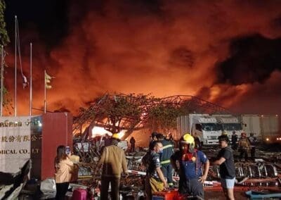 ส่วนบริเวณโรงงานเหตุระเบิดทำให้เกิดเพลิงลุกไหม้ เจ้าหน้าที่เร่งระดมฉีดน้ำนานหลายชั่วโมง จึงสามารถควบคุมเพลิงได้ในระดับหนึ่ง สภาพโรงงานถูกเพลิงไหม้พังถล่มเสียหายทั้งหมด