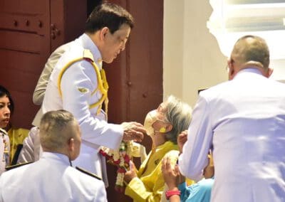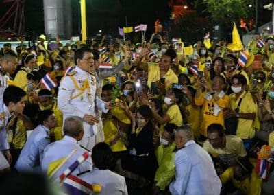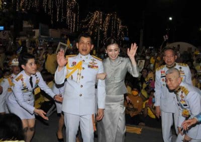 ทรงพระดำเนินไปตามถนนหน้าพระลาน เพื่อทรงเยี่ยมราษฎรที่มาเฝ้าทูลละอองธุลีพระบาทรับเสด็จ ทรงโบกพระหัตถ์ แย้มพระสรวล และมีพระราชปฏิสันถารกับราษฎรอย่างใกล้ชิดกับราษฎรที่มาเฝ้าฯ รับเสด็จตลอดสองฝั่งถนน ซึ่งมารอชื่นชมพระบารมี ทุกคนต่างสวมเสื้อสีเหลืองและโบกธงชาติ ธงพระปรมาภิไธย วปร.และธงพระนามาภิไธย สท.พร้อมเปล่งเสียง “ทรงพระเจริญ” ดังกึกก้องตลอดเส้นทางที่เสด็จฯ ผ่าน บางคนถึงกับกันน้ำตาไม่อยู่ด้วยความปลื้อมปิติที่ได้ชมพระบารมีอย่างใกล้ชิด