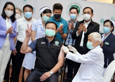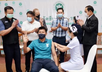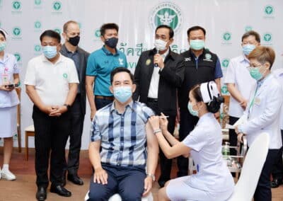 วันนี้ ( 28 กุมภาพันธ์ 2564) เวลา 07.30 น. ณ อาคารหอประชุมอัจฉรา สถาบันบำราศนราดูร กรมควบคุมโรคกระทรวงสาธารณสุข ถนนติวานนท์ อำเภอเมือง จังหวัดนนทบุรี พลเอก ประยุทธ์ จันทร์โอชา นายกรัฐมนตรีและรัฐมนตรีว่าการกระทรวงกลาโหม ในฐานะผู้อำนวยการศูนย์บริหารสถานการณ์การแพร่ระบาดของโรคติดเชื้อไวรัสโคโรนา 2019 (ศบค.) ตรวจเยี่ยมการฉีดวัคซีนโควิด – 19 ให้กับผู้แทนกลุ่มเป้าหมาย บุคลากรทางการแพทย์ด่านหน้า และ อสม. (10 คน) ครั้งแรกในประเทศไทย โดยผู้เข้ารับวัคซีนคนแรก คือ นายอนุทิน ชาญวีรกูล รองนายกรัฐมนตรีและรัฐมนตรีว่าการกระทรวงสาธารณสุข คนที่2 นายสาธิต ปิตุเตชะ รัฐมนตรีช่วยว่าการกระทรวงสาธารณสุข คนที่ 3 นายอิทธิพล คุณปลื้ม รัฐมนตรีว่าการกระทรวงวัฒนธรรม คนที่ 4 นายแพทย์เกียรติภูมิ วงศ์รจิต ปลัดกระทรวงสาธารณสุข คนที่ 5 นายแพทย์โอภาส การย์กวินพงศ์ อธิบดีกรมควบคุมโรค และคนที่ 6 นางกนกวรรณ วิลาวัลย์ รัฐมนตรีช่วยว่าการกระทรวงศึกษาธิการ ตามด้วยบุคลากรทางการแพทย์ พยาบาล และ อสม. ตามลำดับ และในวันนี้ยังได้มีการเตรียมวัคซีนสำหรับ ฉีดกลุ่มเป้าหมายจำนวน 200 โดส